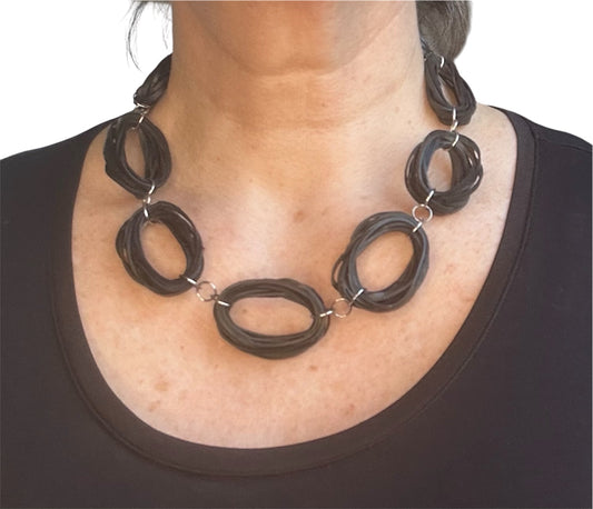 Recycled bicycle inner tubes transformed into beautiful and unusual jewellery.
